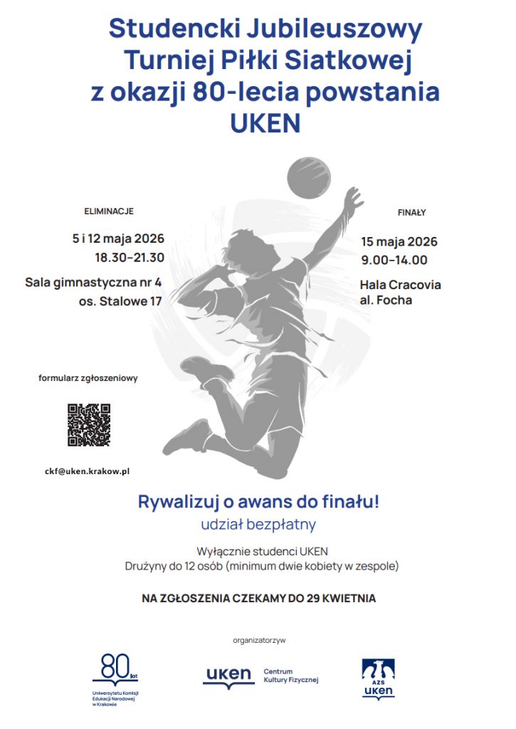 Rozgrywki w ramach Studenckiego Jubileuszowego Turnieju Piłki Siatkowej z okazji 80-lecia UKEN odbędą się w dwóch etapach: eliminacje zostaną rozegrane  5 i 12 maja w godz. 18:30-21:30 na os. Stalowym 17. Dwie najlepsze drużyny z każdego z turniejów zagrają w turnieju finałowym, który odbędzie się 15 maja w godzinach 9:00-14:00 na hali Cracovii, al. Marszałka Ferdinanda Focha 40.  Udział w wydarzeniu jest bezpłatny, a liczba miejsc ograniczona, dlatego o zakwalifikowaniu do turniejów eliminacyjnych decyduje kolejność zgłoszeń. W turnieju mogą brać udział wyłącznie studenci Uniwersytetu Komisji Edukacji Narodowej w Krakowie. Do turnieju można zgłosić zespół maksymalnie 12 osobowy a podczas gry, na boisku muszą znajdować się co najmniej dwie kobiety. Więcej szczegółów w regulaminie.